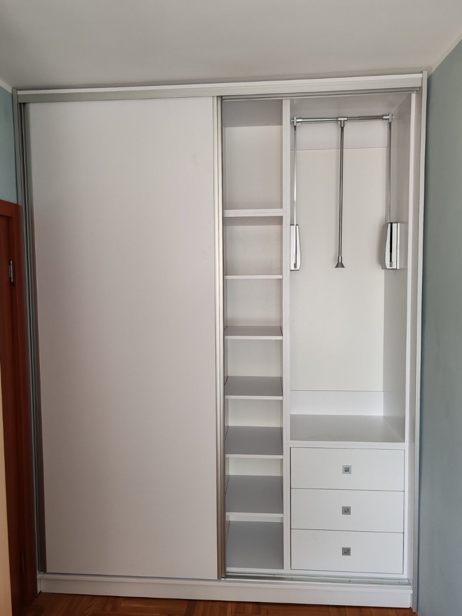 Unutrašnjost plakara pažljivo je organizovana kako bi omogućila pregledno i funkcionalno odlaganje garderobe. Ugrađena garderobna šipka pruža dovoljno prostora za kačenje odeće, dok lift mehanizam omogućava jednostavan pristup višim delovima plakara i čini korišćenje prostora još praktičnijim. Dodatne fioke i police omogućavaju uredno odlaganje odeće, obuće i različitih aksesoara.