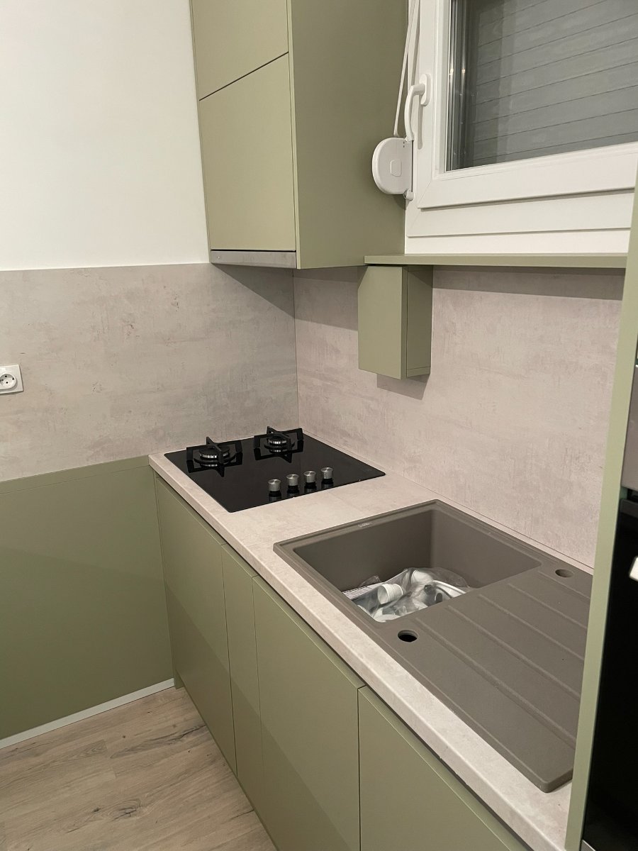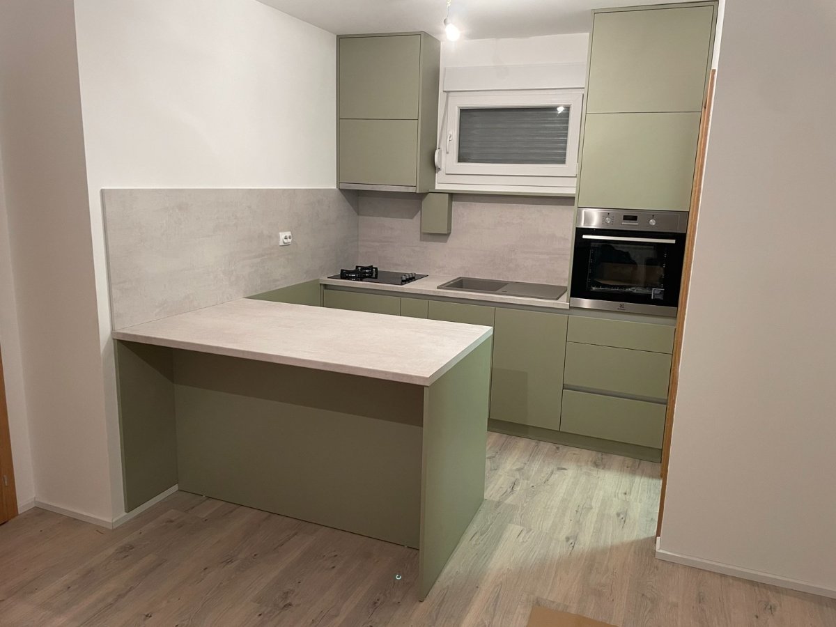 Ova kuhinja u avokado zelenoj boji kombinuje živopisnu eleganciju sa modernom funkcionalnošću. Radna ploča u kontrastnoj nijansi svetlog šljunak-sivo braon dodatno naglašava sofisticiran izgled i stvara harmoničnu kombinaciju boja koja prostoru daje karakter i toplinu.