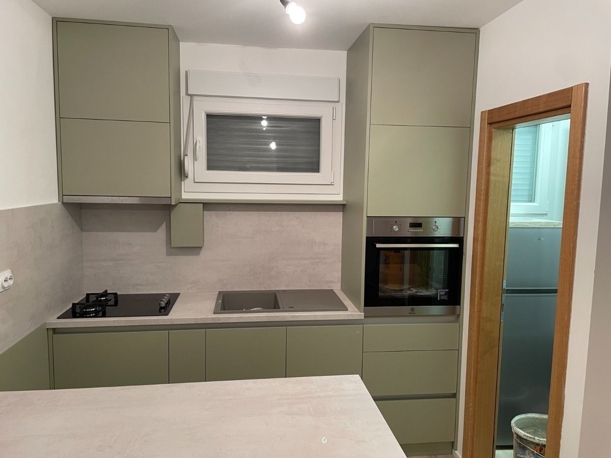 Kuhinja je dizajnirana da bude izuzetno funkcionalna, sa zidnom oblogom u boji radne ploče koja čini prostor vizuelno ujednačenim i estetski prijatnim. Posebno atraktivno je ostrvo, koje služi i kao deo za ručavanje, ali istovremeno sadrži dodatne donje elemente za odlaganje i organizaciju, čineći kuhinju praktičnom i preglednom.