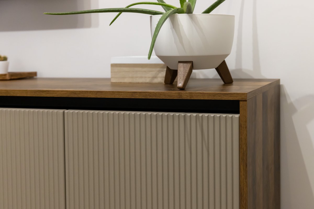 Ova komoda izrađena je u elegantnom dezenu drveta koji prostoru daje toplinu i prirodan karakter. Frontovi su napravljeni od stilskog rebrastog medijapana, što komodi daje posebnu teksturu i moderan, sofisticiran izgled. Rebrasta struktura frontova stvara zanimljivu igru svetla i senke, čineći ovaj komad nameštaja vizuelno atraktivnim i upečatljivim u prostoru.