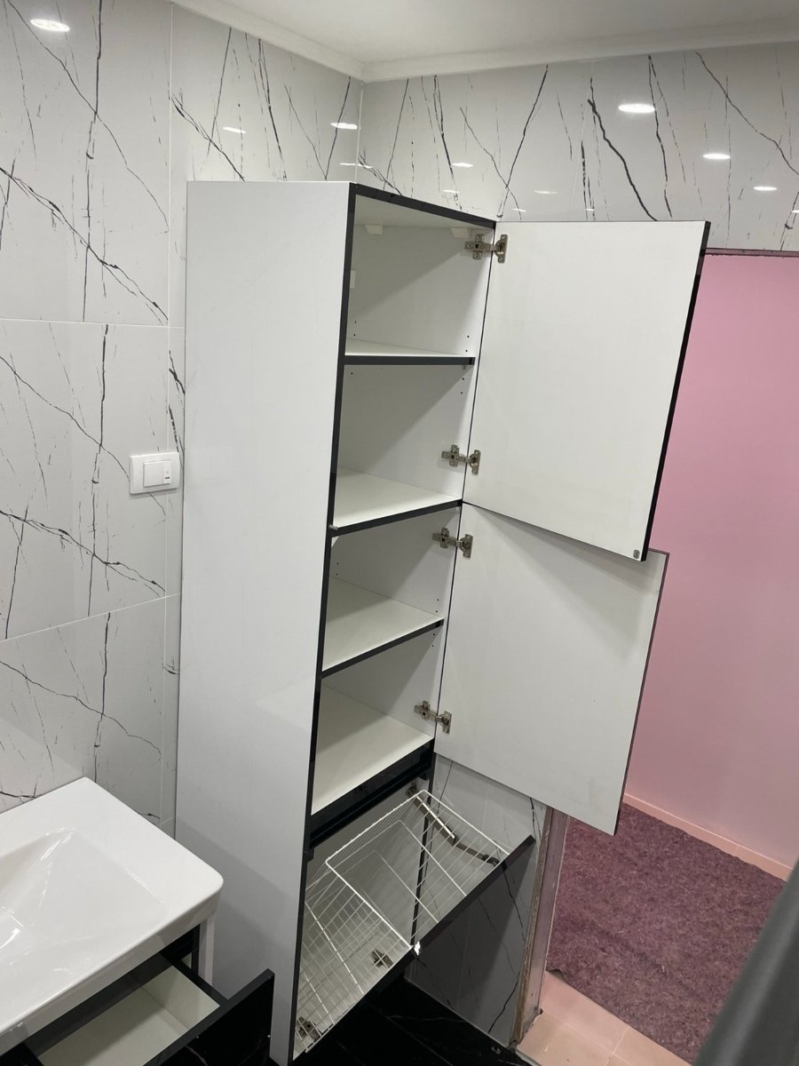 Kupatilski nameštaj izrađen je od kvalitetnog medijapana u belom i crnom visokom sjaju, koji prostoru daje moderan i elegantan izgled. Kombinacija ovih boja lako se uklapa u različite enterijere i pločice, čineći kupatilo vizuelno atraktivnim i skladnim.