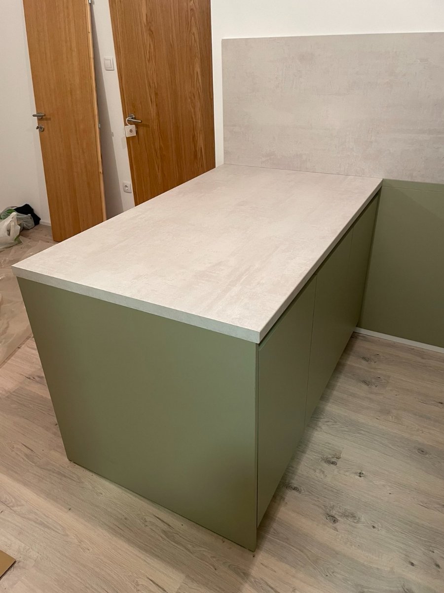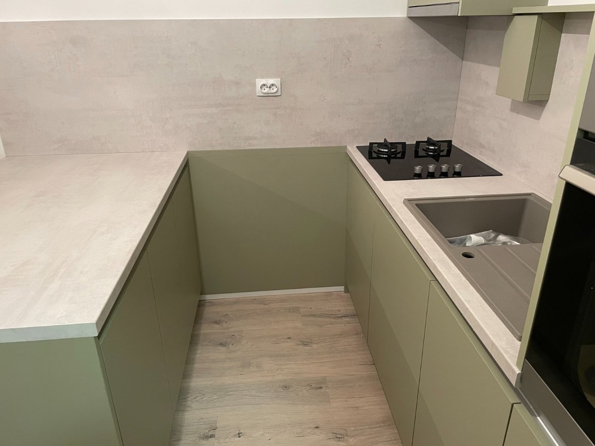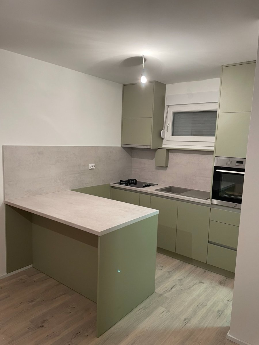 Ova kuhinja u avokado zelenoj boji kombinuje živopisnu eleganciju sa modernom funkcionalnošću. Radna ploča u kontrastnoj nijansi svetlog šljunak-sivo braon dodatno naglašava sofisticiran izgled i stvara harmoničnu kombinaciju boja koja prostoru daje karakter i toplinu.