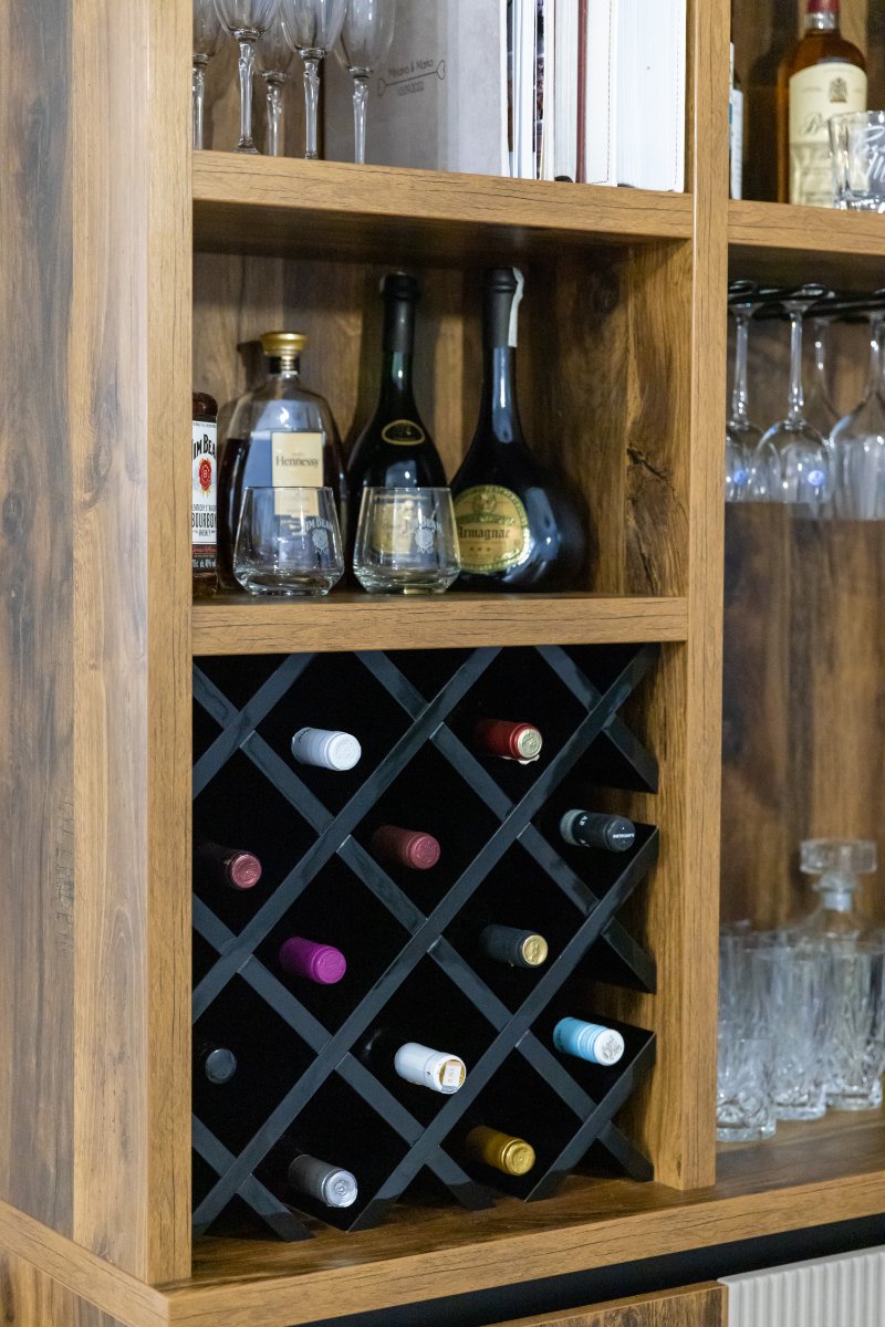 Pažljivo osmišljen raspored elemenata omogućava da se vino i čaše čuvaju na jednom mestu, spremni za svaku priliku – bilo da je u pitanju opušteno veče, druženje sa prijateljima ili posebna proslava. Ova vitrina ne predstavlja samo mesto za odlaganje, već i deo enterijera koji naglašava stil i atmosferu prostora.