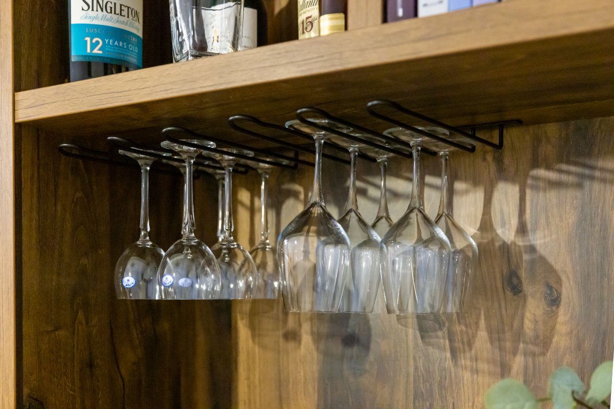 U gornjem delu vitrine nalazi se praktično saće za odlaganje vinskih flaša, koje omogućava sigurno i pregledno skladištenje vina, dok ujedno daje vitrini prepoznatljiv i dekorativan izgled. Pored njega smešteni su držači za vinske čaše, koji omogućavaju da čaše budu uredno raspoređene, lako dostupne i elegantno izložene.