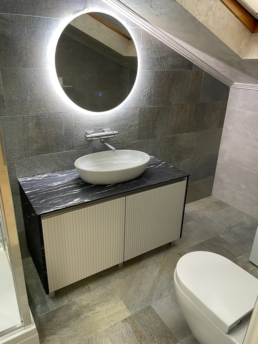 Kombinacija rebrastog medijapana, kompakt ploče u dekoru kamena i LED ogledala stvara skladan spoj elegancije, funkcionalnosti i modernog dizajna.
