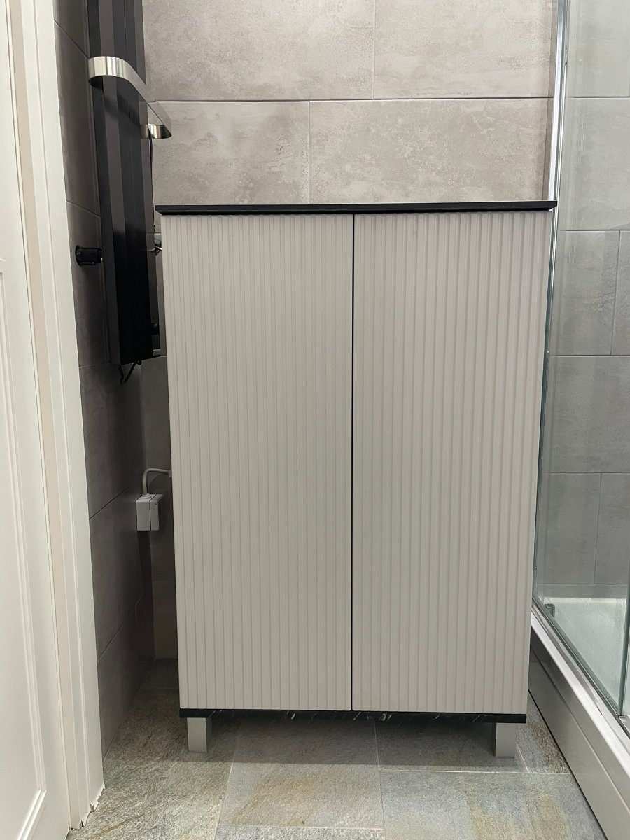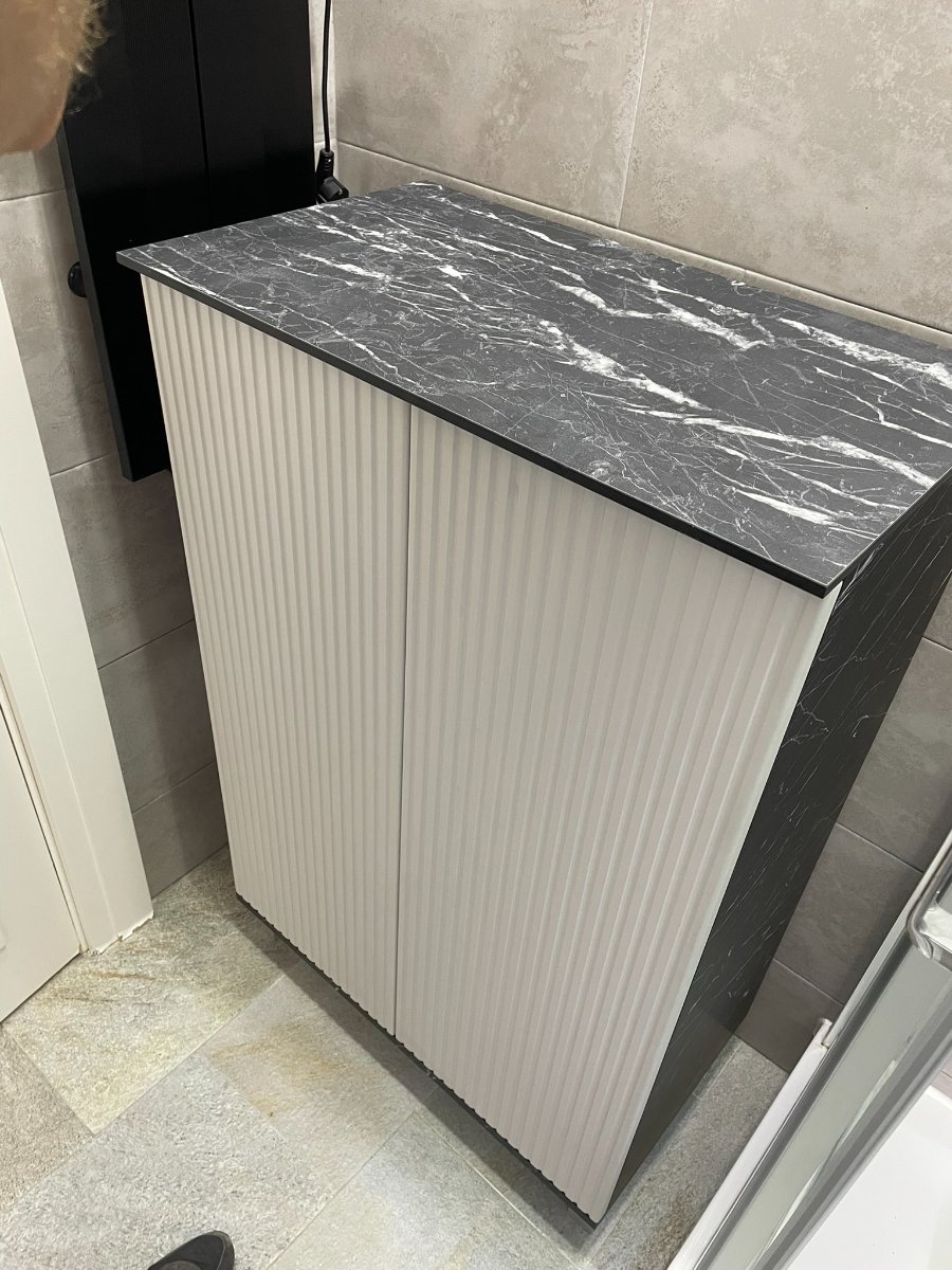 Kupatilski nameštaj modernog i elegantnog dizajna izrađen je od kvalitetnih materijala koji obezbeđuju dugotrajnost i otpornost na vlagu. Frontovi su izrađeni od rebrastog medijapana u sivoj mat antifingerprint boji, koji prostoru daju sofisticiran izgled i poseban vizuelni efekat. Rebrasta struktura frontova donosi dodatnu eleganciju i moderan dizajn koji se lako uklapa u različite stilove kupatila.