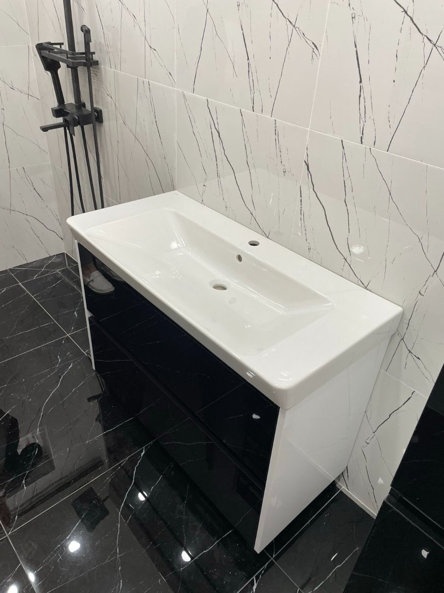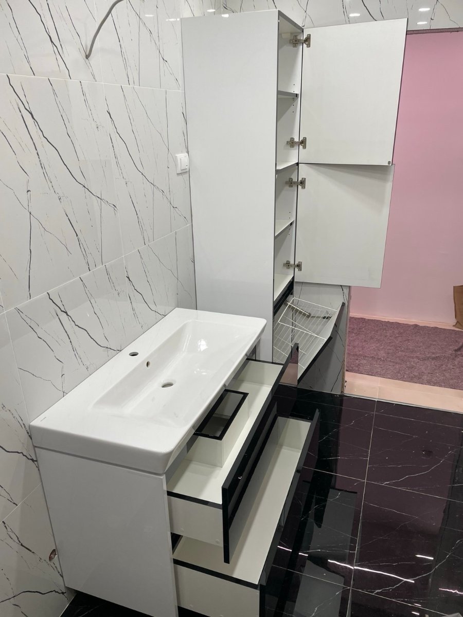 Kupatilski nameštaj izrađen je od kvalitetnog medijapana u belom i crnom visokom sjaju, koji prostoru daje moderan i elegantan izgled. Kombinacija ovih boja lako se uklapa u različite enterijere i pločice, čineći kupatilo vizuelno atraktivnim i skladnim.